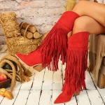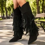 Women’s Retro Slim Calf Fringe Knee-High Cowboy Boots – Pointed Toe, Chunky Block Heel, Vintage Pull-On Western Style